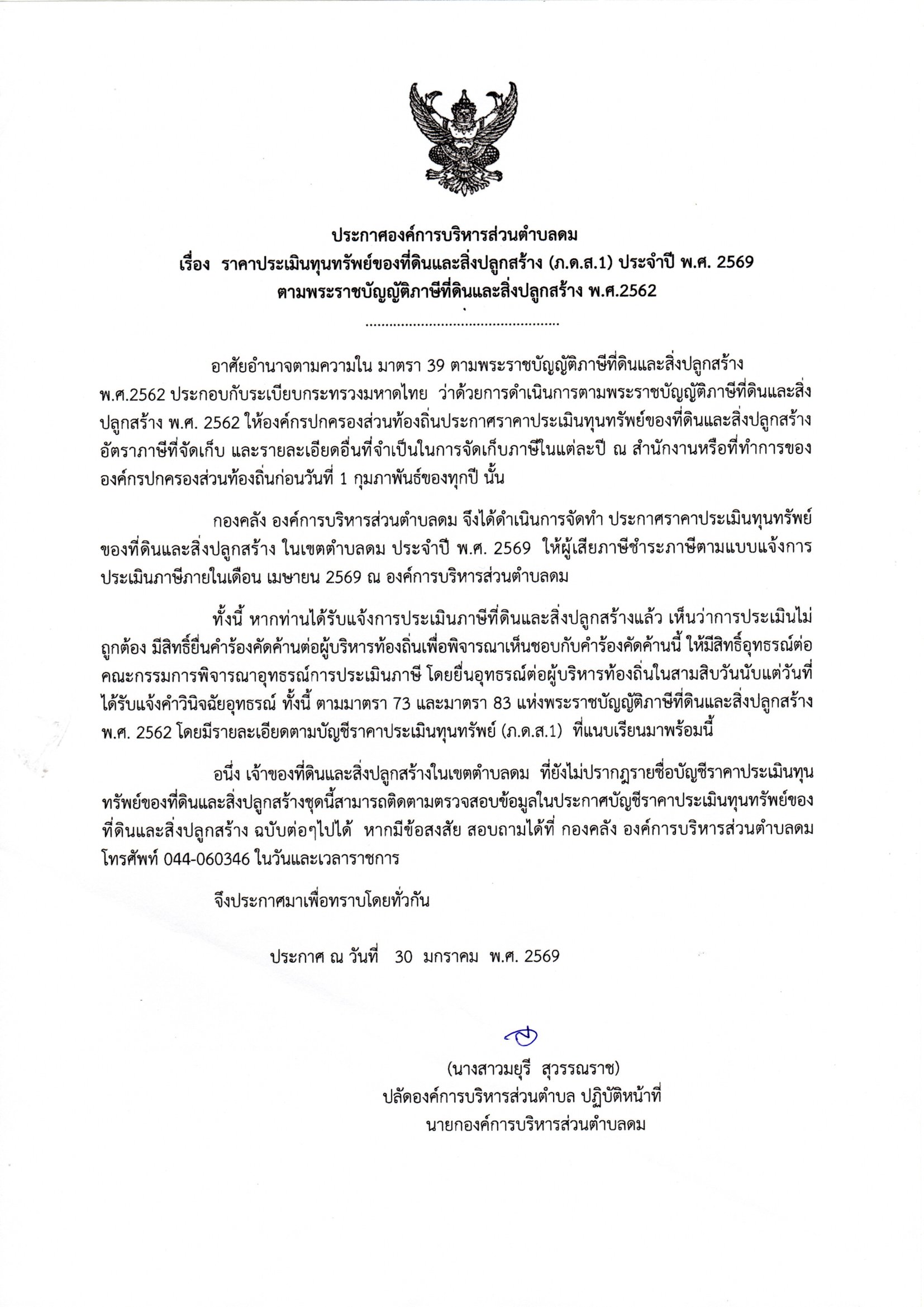 ประกาศ เรื่อง ราคาประเมินทุนทรัพย์ของที่ดินและสิ่งปลูกสร้าง (ภ.ด.ส.1)ประจำปี 2569