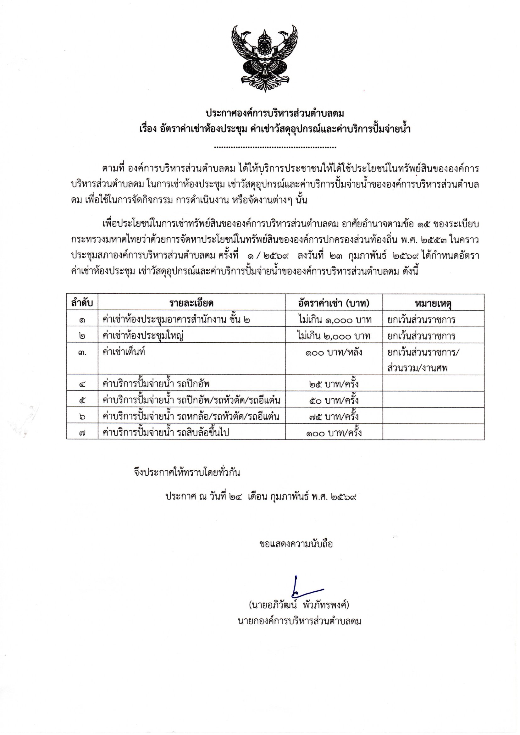 ประกาศ อัตราค่าเช่าห้องประชุม ค่าเช่าวัสดุอุปกรณ์และค่าบริการปั๊มจ่ายน้ำ
